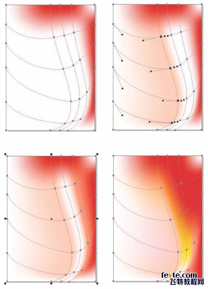 对网状填充格进行所有这些调整后,现在可以准备添加一些颜色了。要添加颜色,请使用形状工具 (F10) 选择一些节点。首先聚集网状填充格的周长,然后在内部进行操作。要产生平滑的色彩明暗度,请在默认调色板的红色色板(或您选择的任何颜色)上按 Ctrl+单击。此方法可在每次按 Ctrl+单击时将所选的色调增加 10%。最后,对最中间的列添加一抹黄色。