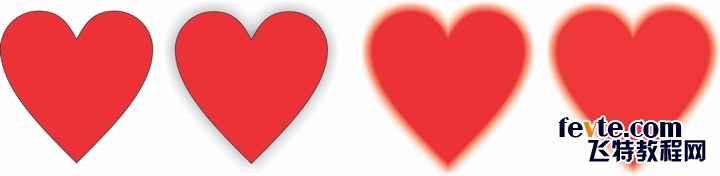 背景上还需要一些红心。我们可以使用一些小技巧,仅复制某些红心的阴影,而不是简单地复制几颗红心。如何操作?非常简单。首先,为最初的完美形状红心添加阴影,并将其颜色更改为红色。然后在属性栏上,将阴影不透明度滑块移到 100,并从"羽化方向"选择器中选择外部。