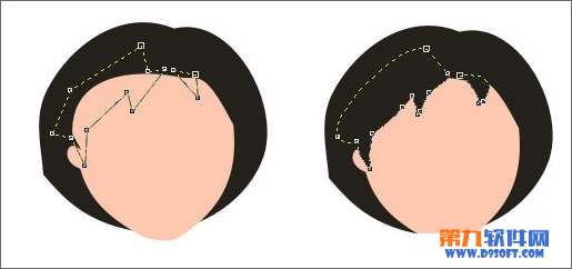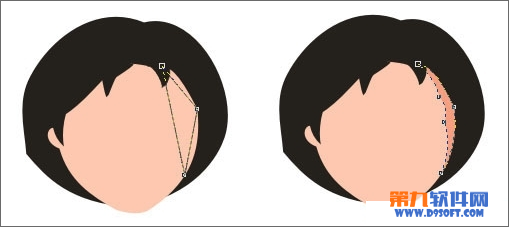 用贝塞尔工具画出挡在脸前面的头发,用形状工具选中全部节点,按ctrl+Q转换为曲线后调节为如下形状,填充黑色,注意调节头发尖尖的位置。