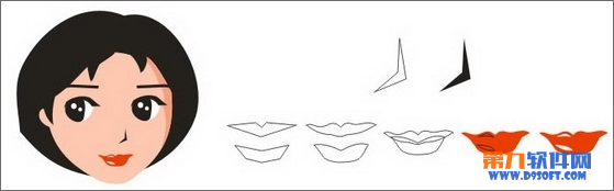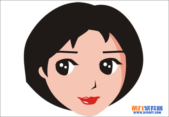 用贝塞尔工具画出如下形状,填充黑色,形成鼻子,放在脸部合适位置。用贝塞尔工具分别画出上下唇的基本形状,按ctrl+Q转换为曲线后用形状工具调整到如下形状和位置,填充红色。在上下唇上各画出如下形状,填充白色形成高光增加嘴唇立体感,完成整个嘴后按ctrl+G群组,放在脸部合适位置。