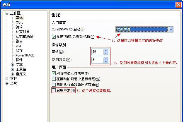 撤销级别就是你在coreldraw x5中按ctrl+z的步数,如果你的电脑配置够好,可以相应的设置多一些,不过要注意的是撤销级别太多会占用大量内存,你自己考虑吧。