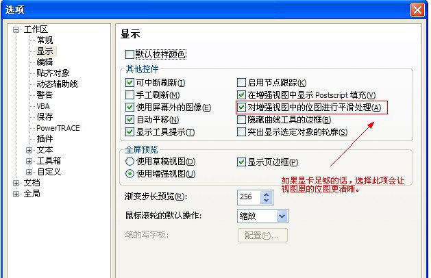 选择是否对增强视图中的位图平滑处理,也对coreldraw x5的速度有影响。