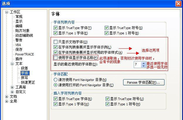 发现coreldraw x5切换字体卡的原因没有?其实就在上面的"使用字体显示字体名称"那里,取消"使用字体显示字体名称"你就会发现,你的coreldraw x5切换字体再也不卡了。
