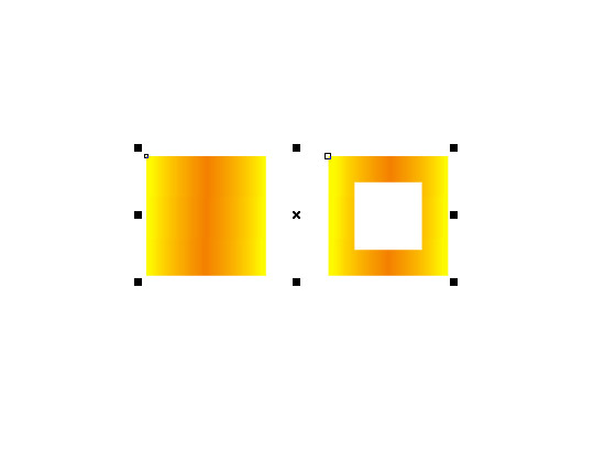 第三步、现在绘制完了圆。我们把里面的正方形进行一个挖空的效果。首先绘制一个小正方形,填充一个黄色-橙色-黄色的渐变,填充完成后在复制一个正方形进行备用,将一个正方形按住shift键缩小复制一个小正方形,然后将两个正方形进行组合。做出里面挖空的方形效果。如图所示:
