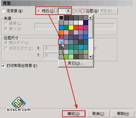 (5)在打开的"背景设置对话框"中选择"纯色",并在下拉颜色选择框中选择天蓝色,单击"确定"按钮,设置完毕。