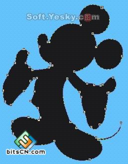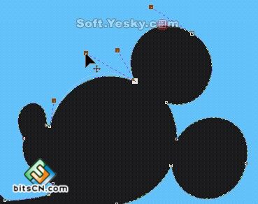 然后再选择"形状工具",在需要变为曲线的线段中间点击一下,然后在"属性栏"的"编辑曲线、多边形和封套"中单击一下"转换直线为曲线",这时在这条线段上就会出线两个调整节点,用鼠标拖动这条线段或是拖动调整节点则可以对这条线段进行调整,最后调整出一个米老鼠的大致形状,并调色板上单击黑色填充。