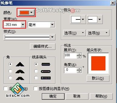 按下F12调出"轮廓笔对话框",设置"颜色"为红色,"宽度"为0.353mm。