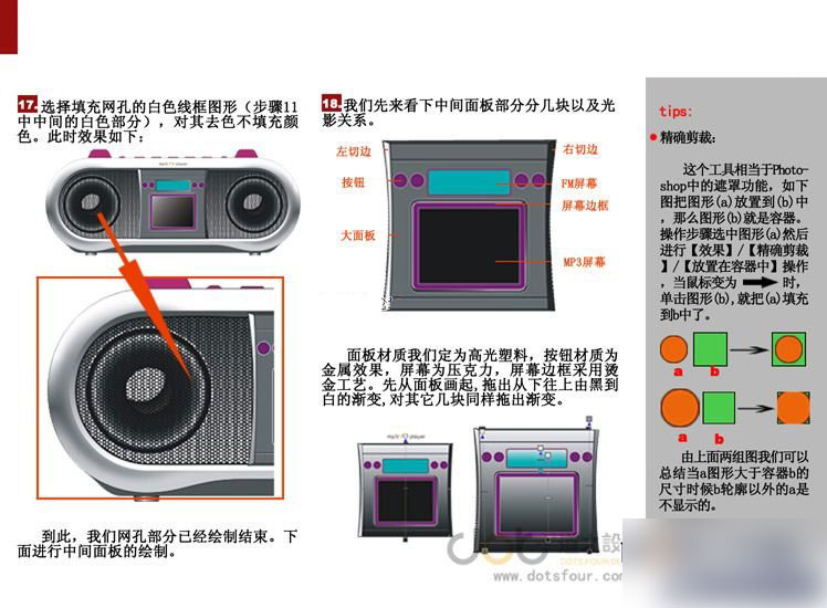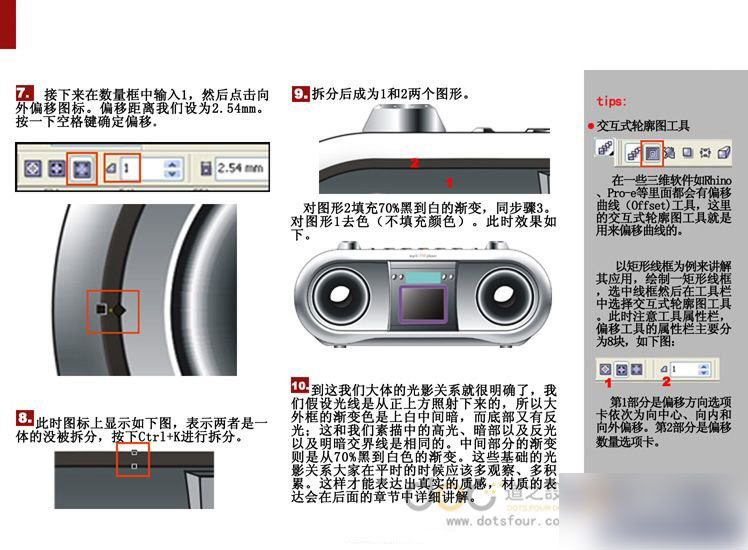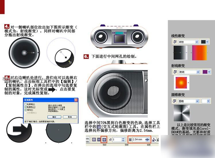 今天的教程将介绍用CDR来绘制一个录音机的方法,主要讲解一下产品明暗关系在CDR中是如何表现的。CCDR最好用的工具个人认为就是渐变,记得一个高手说过:CDR就是拉拉渐变。当然高手对CDR的理解和我们的不一样,高手善于将复杂的事物简单化。好吧,我们看看CDR是否就是'拉拉渐变'。