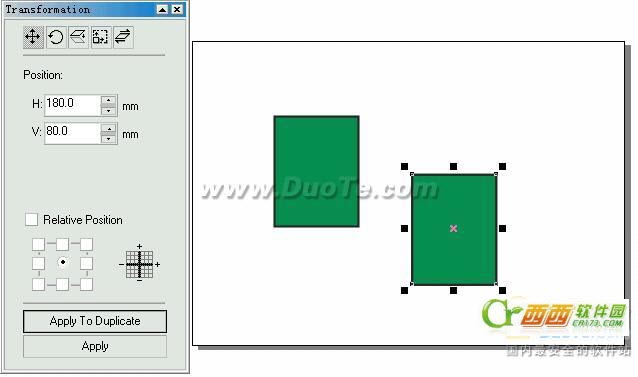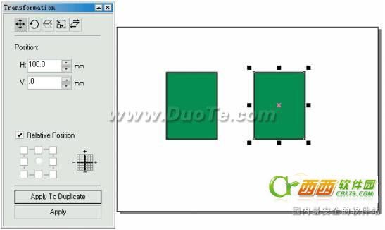 在Transformation (变换)面板中,.如果选中Relative Position(相对位置)复选项,还可以将对象或其副本沿某一方向移动到相对于原位置指定距离的新位置上去 。也就是说,将原对象的定位点作为相对的座标原点,直接输入在各个方向要移动距离的值即可。