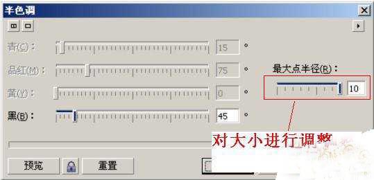 先做出一个渐变的图形,再将其转成位图,然后打开"位图栏"再选"色彩转换"里面的"半色调"。选择半色调后会跳出下面的对话框: