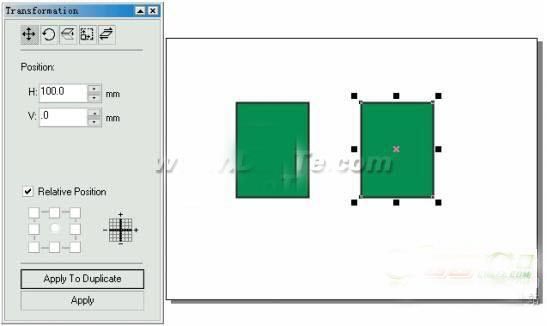 在Transformation (变换)面板中,.如果选中Relative Position(相对位置)复选项,还可以将对象或其副本沿某一方向移动到相对于原位置指定距离的新位置上去 。也就是说,将原对象的定位点作为相对的座标原点,直接输入在各个方向要移动距离的值即可。