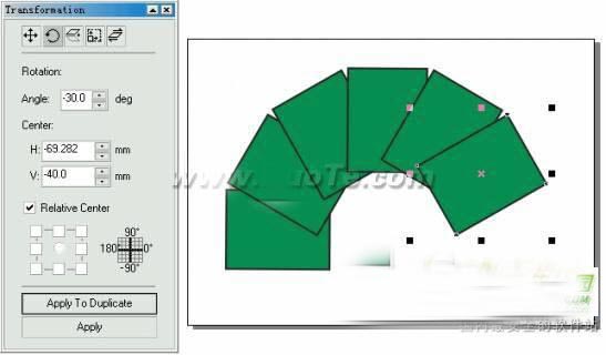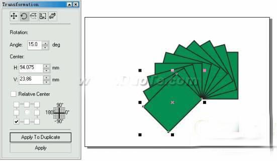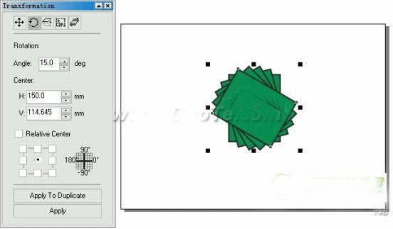 注意:对对象进行旋转操作时,如果没 有选中Relative Center(相对中心)复选项,在Center(中心).标签下的两个微调框中显示的坐标值是该对象定位点的绝对坐 标值;如果选中Relative Center(相对中心)复选项,则在Center(中心)标签下的两个微调框中显示的坐标值是新的相对中心点相对。