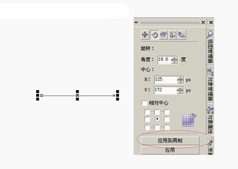 用CorelDRAW 11建立一个新文件。用手绘工具绘制一条水平线。我们只需按住鼠标左键在水平方向拖动,即可绘制出水平的直线。在默认时,软件自动修正轨迹,即使我们手有点抖,也可以轻松的画出直线。下面从菜单中的窗口->泊坞窗->变换->旋转,打开变换泊坞窗(如图2)。