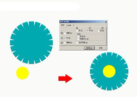 使星形保持在选中状态下。点击菜单"排列"下的"结合",或直接按快捷键"ctrl+l",把这些线条结合为一个对象。齿轮中间有一个孔,下面我们给齿轮中心挖一个孔。使用椭圆工具画一个适当的圆。选中所有图形,按住alt键,再按三次A键(按钮alt键是用来激活菜单,按一次A键展开排列菜单,再按一次A展开对齐与分布菜单,第三次按A键,执行其下的对齐和属性,打开对齐与分布对话框,由于一步步的有鼠标展开菜单比较麻烦,一般常用的命令都使用快捷键,在CD9上面只需按两次A键即可)。打开"对齐与分布"对话框。选中水平中心和竖直中心,点应用按钮,对齐图形(如图5)。