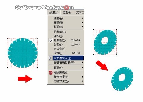 为了使效果更好,我们来给齿轮添加透视效果。选中齿轮点菜点效果下的添加透视点。这时齿轮上面出现红色的网络,用鼠标拖动可以添加透时效果。软件自动生成的透视,十分的准确,比手绘要方便许多(如图7)。我们最好复制一份没有添加透视的齿轮备用。