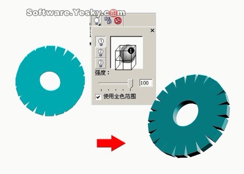 复制一个未添加透视效果的齿轮图形。选用"交互式立体化工具",点击图形,拖动光标到图形中心。注意这是重点,一定要拖动到中心。在工具栏上设定"深度"为"1",其实就是设定齿轮的厚度,我们设定成一个比较薄的齿轮。如果深度设定的比较大,齿轮就会因为太厚,看上去像一个柱体。点工具栏上的"立体的方向按钮",弹出一个小调节面板,面板上有一个字符"3",用鼠标左键拖动,把字符"3",转动一个适当的角度。这样就产生了真实的透视效果(如图10)。不过现在可能看不到效果,让我们在下一步中增加效果。