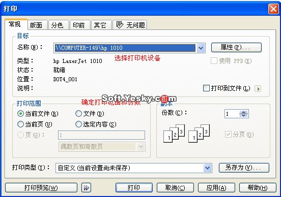 首先设置打印机,本文中以HP1010为例(最大可打印幅面为A4)。在这里罗嗦几句:可以选择本地打印机,也可是网络打印机,不过要确保正确安装并能使用。