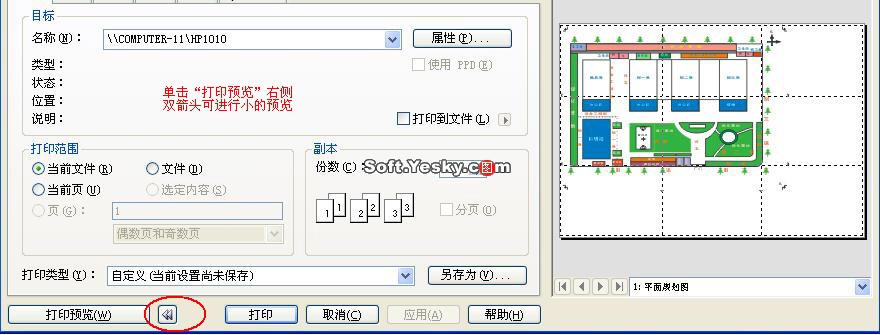 在打印对话框中的常规标签,单击打印预览右侧的双箭头按钮 ,可以快速预览打印对话框中的打印作业。