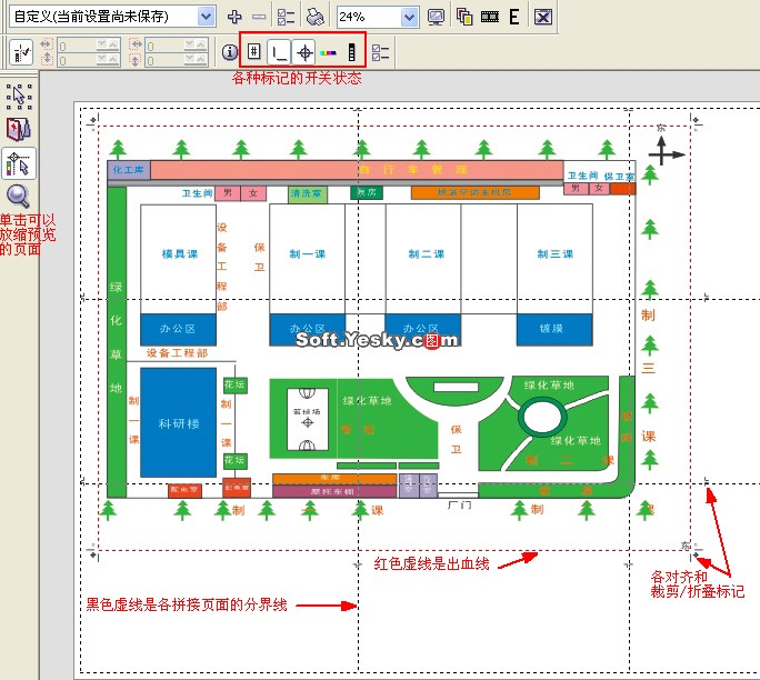 在进入的大预览窗口中,上面的工具栏分别指示出平铺对齐标记的位置,裁剪折叠标记等标记的开关状态。