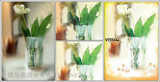 8.1.1技术提示水彩绘画效果的制作方法,与前面介绍过的素描绘画方法大同小异,都使用到位图处理程序Corel PHOTO-PAINT。创建画面的水彩画纹理和笔触效果主要是为素材图片应用各种效果命令制作而成。对画面的修饰,如设置背景、添加文字效果等,则是在CorelDRAW中制作完成的。如图8-3所示,为本实例的制作流程。