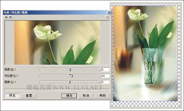 (2)执行"文件"→"导入"命令,将本书附带光盘中的"鲜花.jpg"文件导入,单击并拖动鼠标在视图中绘制图像。然后执行"图象"→"调整"→"亮度/对比度/强度"命令,在对话框中对参数进行设置,调整图像色调。如图8-5所示。