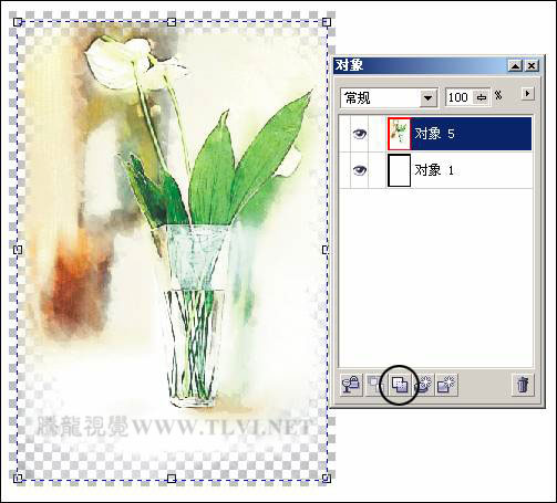 (4)选择"对象 3",使其成为当前可编辑状态,执行"效果"→"底纹"→"画布"命令,在对话框中进行设置,为图像添加画布效果,并在"对象泊坞窗"中设置"对象 3"的"合并模式"为"颜色",效果如图8-7所示。