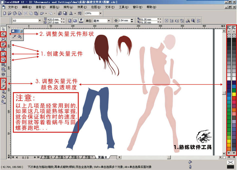 图解-1.熟练软件工具 (1).创建矢量元件 (2).调整矢量元件形状 (3).调整矢量元件 颜色及透明度
