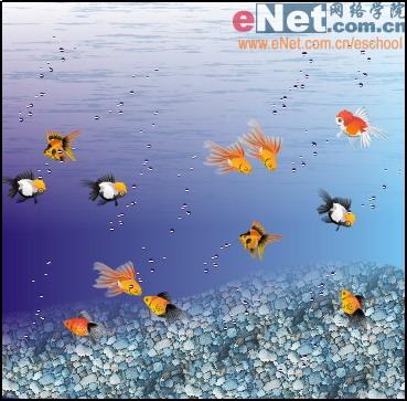 14、选取所需要的金鱼和泡泡,将摆放在图形中的不同位置,至此,这张图就完成了。看一看这些美丽的鱼儿,心情也会变得很美丽。最终效果如图7所示。