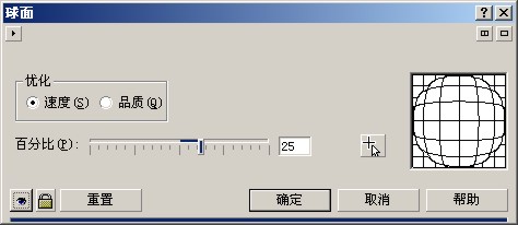 5.确定位图被选中,选择"位图/三维效果/球面",在弹出的对话框中输入百分比参数为"25","优化"项选择"速度"单选扭,如图: