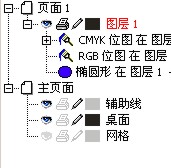可以看到当前页面为页面1,已经有了一个名字为"图层1"的图层,它的下方指示出这个图层上拥有的对象,选择"椭圆在图层1..."条,将它向上拖动两个位置。现在在绘图区已经能够看见那个圆了,选中它,选择一种蓝色对它进行填充,同时取消轮廓色填充。