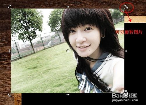 4、适当调正图片位置。将鼠标移动到图片边缘,当鼠标变为”↔“时即可调整图片大小,单击选中图片当鼠标变为圆形”↔“,即可旋转图片。