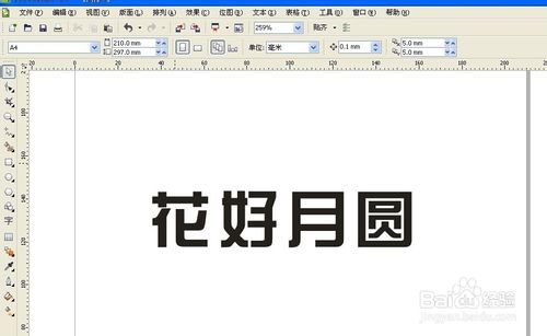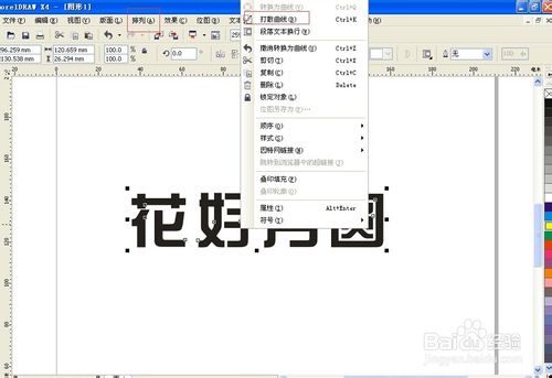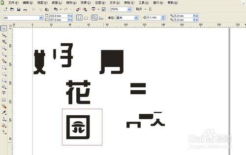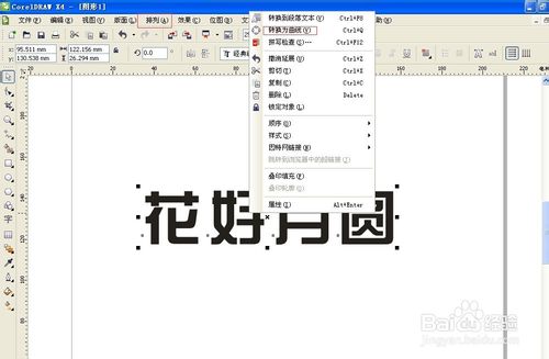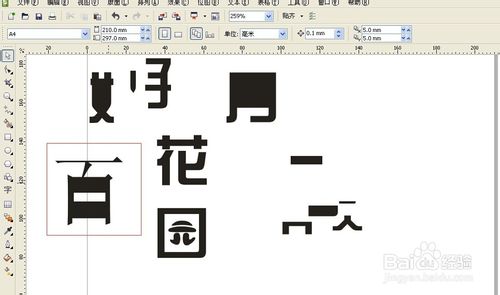 3、文字转为曲线。为了和以后的某些部首结合。(转曲:排列-转曲,右击文字-转曲。快捷键则Ctrl+q,在和别的快捷键不冲突前提下可以用)