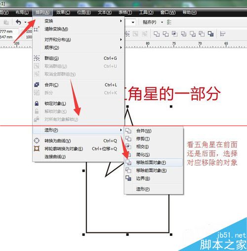 2、同时选中正方形和五角星,确定五角星是在正方形前面还是后面,本文中五角星是在正方形后面,如果点击排列--造形--移除后面对象。注意:如果五角星是在正方形前面,则移除前面对象。