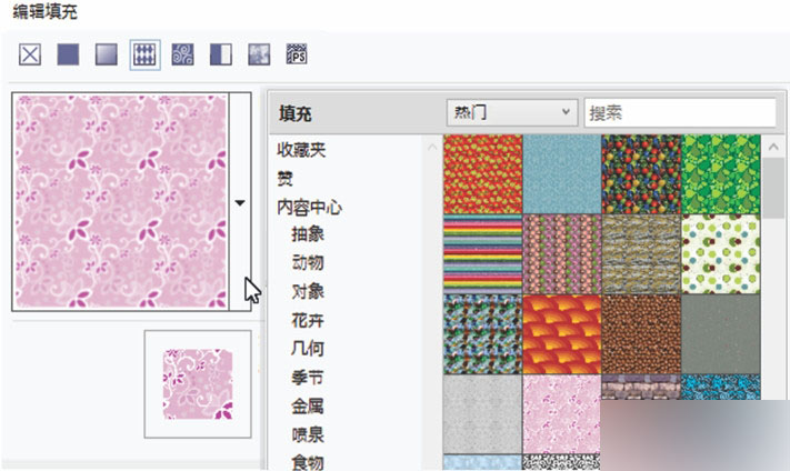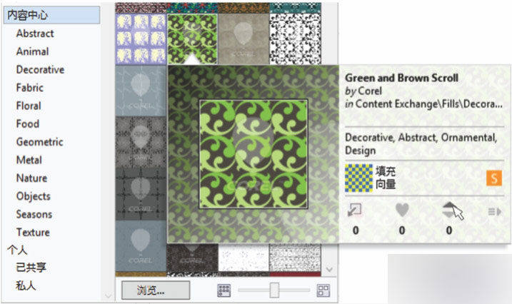 可从属性栏、"对象属性"泊坞窗和"编辑填充"对话框访问新增的填充选择器,使搜索、预览和选择填充变得快速而又轻松,还可以访问本地存储的填充和内容中心中提供的填充。