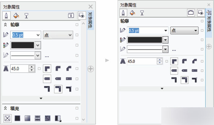 重新设计的"对象属性"泊坞窗具有一个新的选项卡选项,可帮助新用户降低拥挤程度,提高效率。"滚动/选项卡模式"按钮可将泊坞窗设置为一次仅显示一组格式控件,使用户更容易专注于手头的任务。