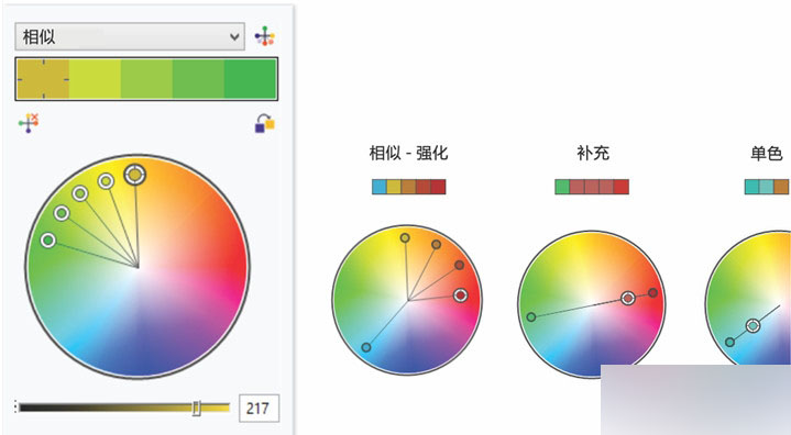 借助新的和谐规则,可以使用预设组合按预定值转换颜色和谐中的所有颜色,还可以使用和谐规则从头开始创建新的颜色和谐。