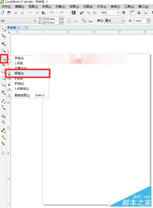 1、打开CorelDRAW的软件,选择工具箱中的钢笔工具,在画布上先点击一下,再点击拖动画出一条曲线,后面的依次继续,画到最后一步后,直接按空格键结束曲线绘制。