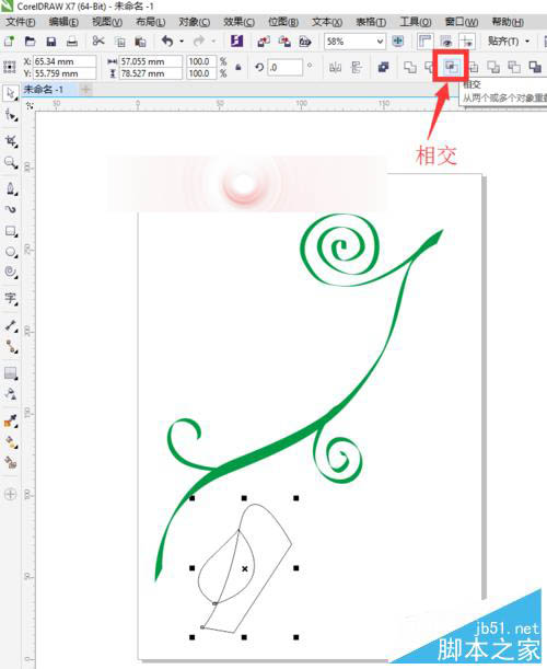9、选择工具箱中的选择工具,选中绘制的两个整体,再属性栏中选择相交。相交之后,我们再选择属性栏中的修剪,再把多余的删掉,剩余的叶子其实是两个半边拼在一起的。为了方便大家观看,夏夏将两部分的叶子拆开了给大家看。