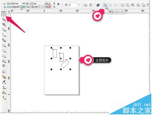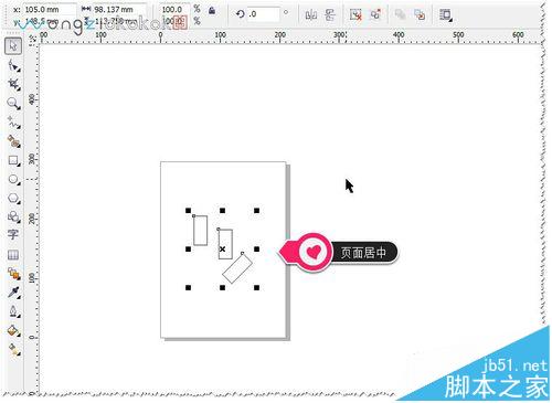 3、如果图案中有多个对象,要使图案不改变图形的效果在页面中居中显示。首先选中所有图形并群组(快捷键:CTRL+G),然后在键盘中按P即可。如图