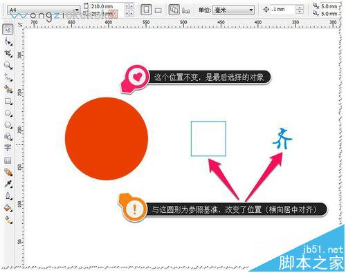 13、对齐时的选择顺序也是很关键的哦。最后选择的那个对象是参照基准的哦——所以最后选的那个对象是不改变位置的,其它的图形与最这个对象为参照基准而改变的。