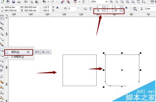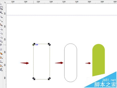 1、首先我们需要操作的就是,打开cdr软件,打开之后我,我们找到矩形工具,画一个矩形,然后我们需要将下面两个角转化为椭圆,效果我们见下图所示;