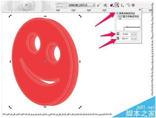 9、使用立体化工具——斜角修饰边工具——做出斜角并调节好参数——达到满意效果为至。如图