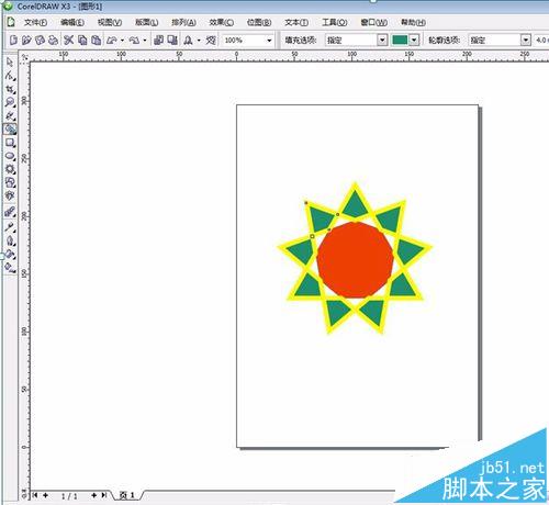 5、在属性栏把填充颜色更改为绿色,设置轮廓选项为【指定】,轮廓宽度为4.0mm,轮廓颜色为黄色,然后单击星形的边角填充颜色和轮廓。