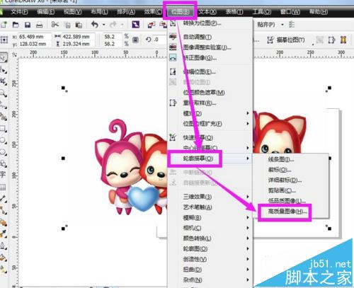 4、接着,如下图那样,在软件界面上方里找到“位图”的选项,用鼠标点击它,在它的下拉列表里面选择“轮廓描摹”,然后再在展开的列表选项里点击“高质量图像”。