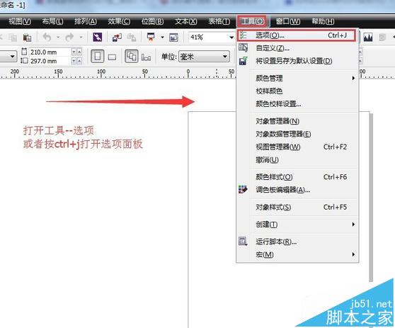 2、在菜单栏中打开工具--选项或者按ctrl+j快捷键打开选项面板。对工作区、文档、和全局的预设值进行调整。