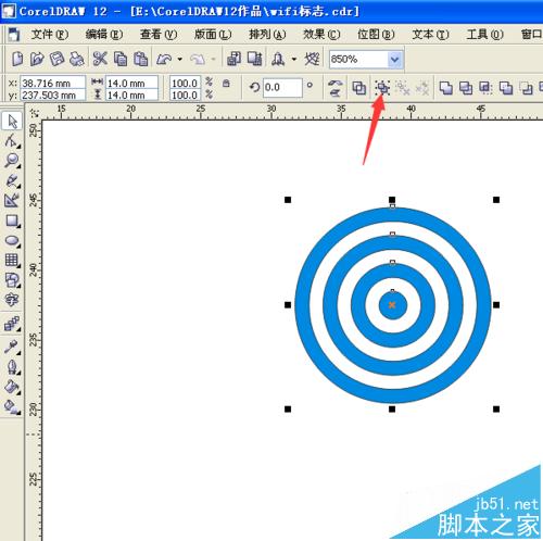 13、用”挑选工具“,再把所有个对象全部选择上,再点击上边属性栏的”群组“按键,把对像进行群组。