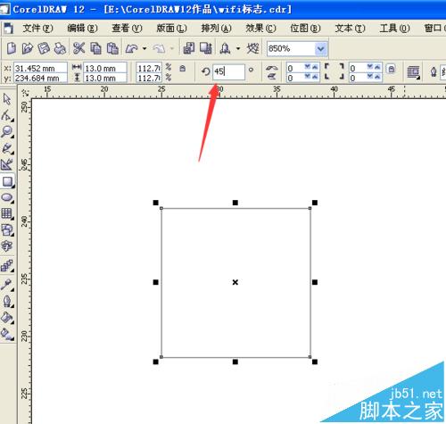 17、选择”挑选工具“,再选择正方形,把鼠标放在正方形的下边的位置,直到鼠标显示为四个箭头时,就按着鼠标左键,将正方形拖到圆的中心位置再放开鼠标。当正方形拖到圆的中心位置的时候,圆心就会像磁铁一样吸住正方形的。