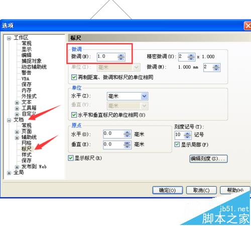 18、选择“工具”菜单--选项--文档--标尺,将标尺的微调设置为1,再按页面的确定。