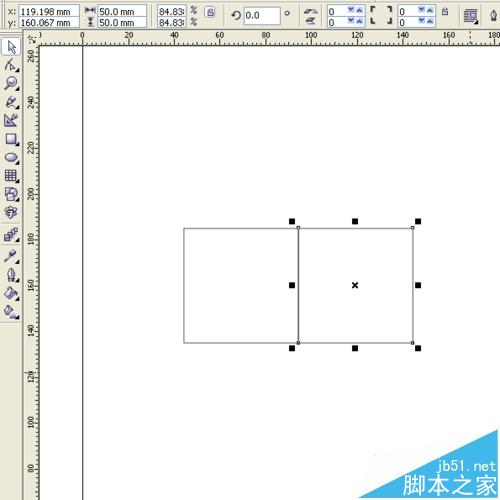2、用挑选工具选择正方形,再按一次数字键盘的“+”键,就可以在原地复制出一个正方形来,将这个正方形移到右边,让两个正方形并排相连着。