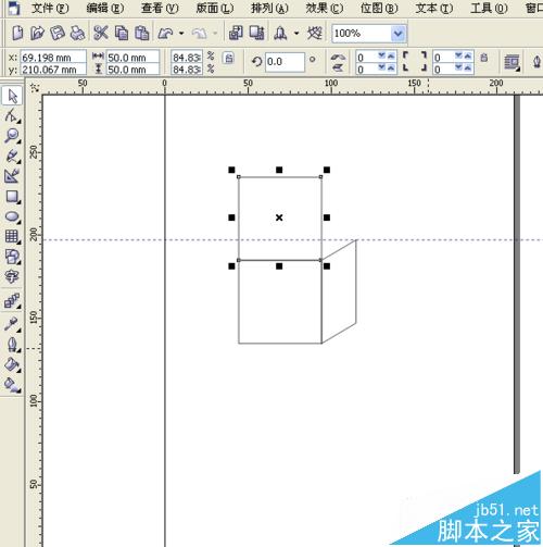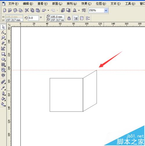 8、将上边的正方形,用挑选工具,从上边往下边缩小一些,好让上边的边和辅助线刚好在同一条线上。